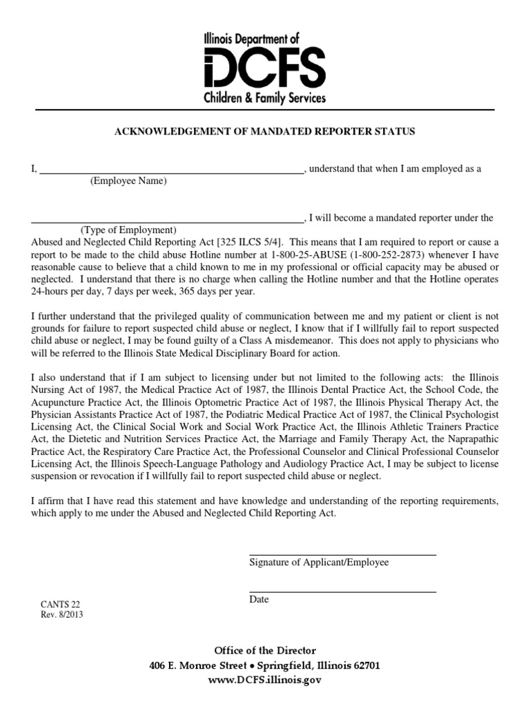 Do not use this form if you are an applicant for licensure or an. Easily fill out pdf blank, edit, and sign them. The revised dcfs process for required cants clearances is as follows: Web www.dcfs.illinois.gov acknowledgement of mandated reporter status i, , understand that when i am employed as a.