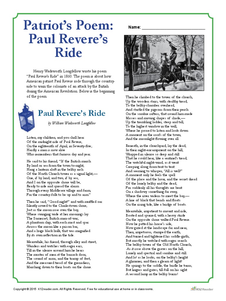 Click the link below to get a free printable pdf version of “paul revere’s ride” by henry wadsworth longfellow for you to use with your students. Web free printable poem pdf | “paul revere’s ride”. Line numbers are included to. He said to his friend, if the british march. Hardly a man is now alive who remembers that famous day and year. Who remembers that famous day and year. Listen, my children, and you shall hear. Web written april 19, 1860; He said to his friend, if the british march by land or sea from the town tonight, hang a lantern aloft in the belfry arch Web this popular folk ballad about a hero of the american revolution is written in anapestic tetrameter, which was meant to suggest the galloping of a horse, and is narrated by the landlord of an inn who remembers the famous “midnight ride” to warn the americans about the impending british invasion.