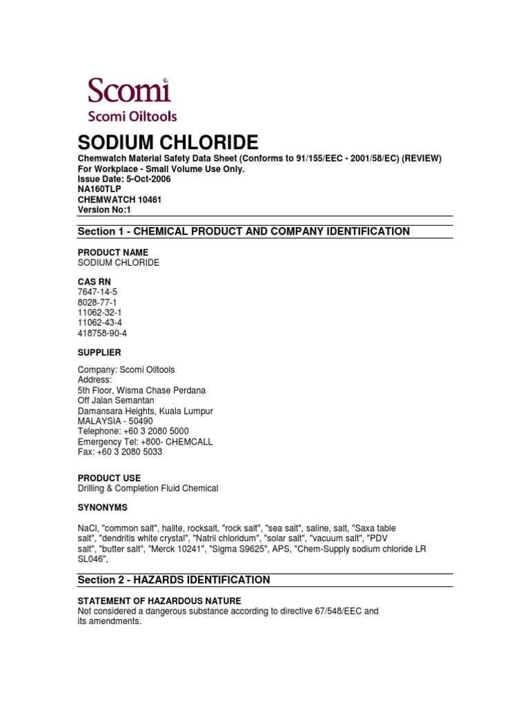 Sodium Chloride Section 1 Chemical Product And Company Identification