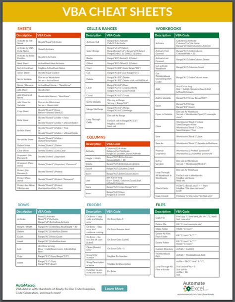 VBA Cheat Sheets / Commands List vba